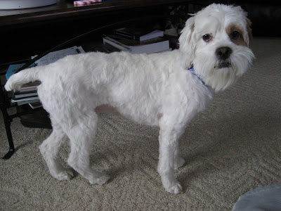 I took Waffles to the groomer this morning and when I dropped him off I asked for him to be short all over and give him a "teddy bear" face. I wanted his beard and 'stache gone and his ears trimmed up. When I got home, this is how he looked. Cute--but not what I asked for. Check out the weird, long hair on the end of his tail. What's up with that? I really do like the place that we take him. It's a little, locally owned shop just right up the road and the ladies in there love Waffles and Waffles seems to like going there. They do a good job--they just don't know what a teddy bear looks like.
